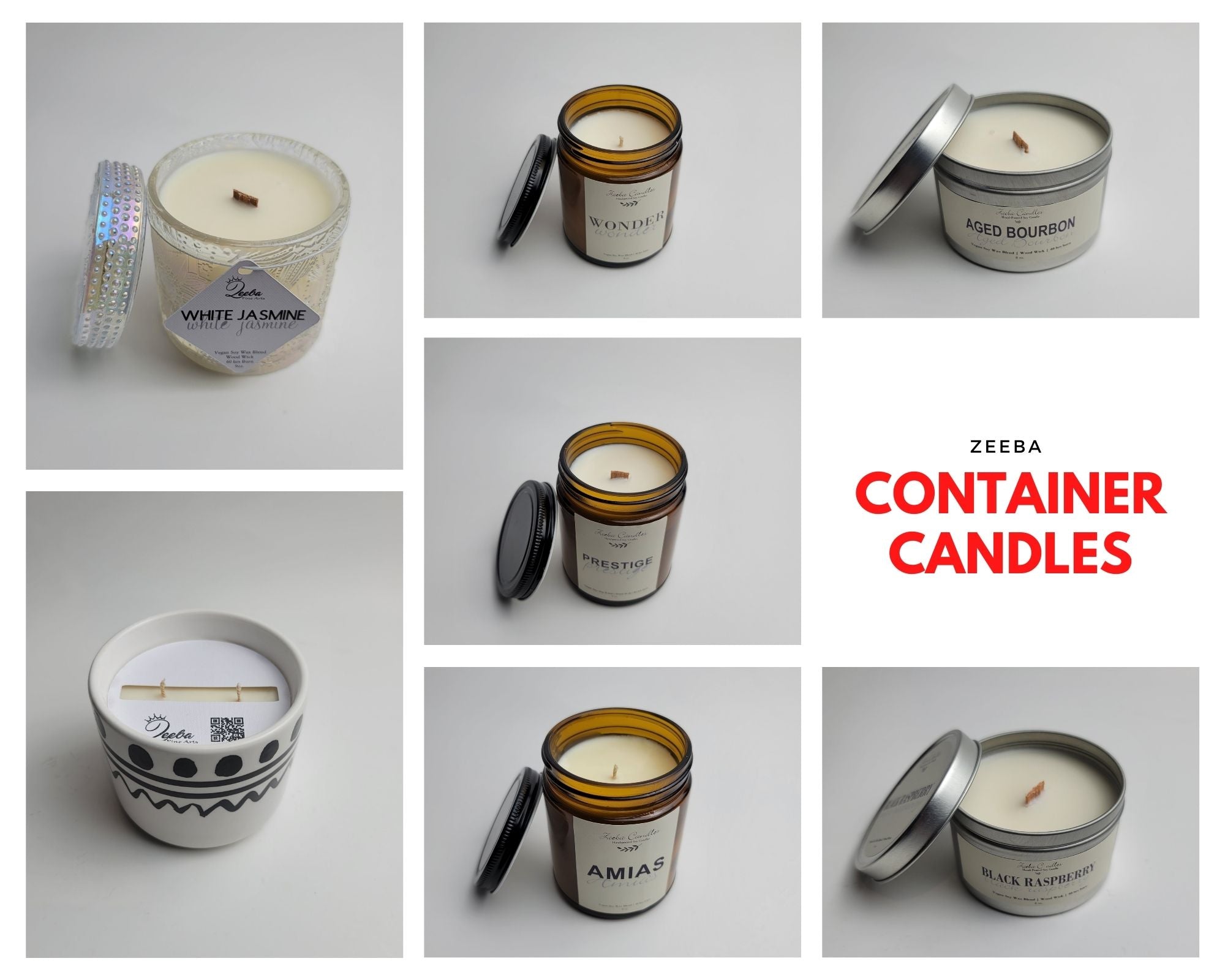 The 100% soy container candles from Zeeba Fine Arts are the perfect addition to any home decor. Made with 100% soy wax, these candles are natural, eco-friendly and sustainable. They come in two options of wick type, wood wick or 100% cotton wicks, both providing a unique and clean burn. The wood wick candles give a crackling sound when burning, giving a feeling of a wood fire, while the cotton wick candles provide a steady and consistent flame. These candles come in a variety of scents and colors, and they are perfect for adding ambiance to any room, whether you're looking to create a cozy atmosphere or to add a touch of elegance to a special occasion. These candles are long-lasting, providing hours of burn time, and they are also available in different sizes to suit your preference.